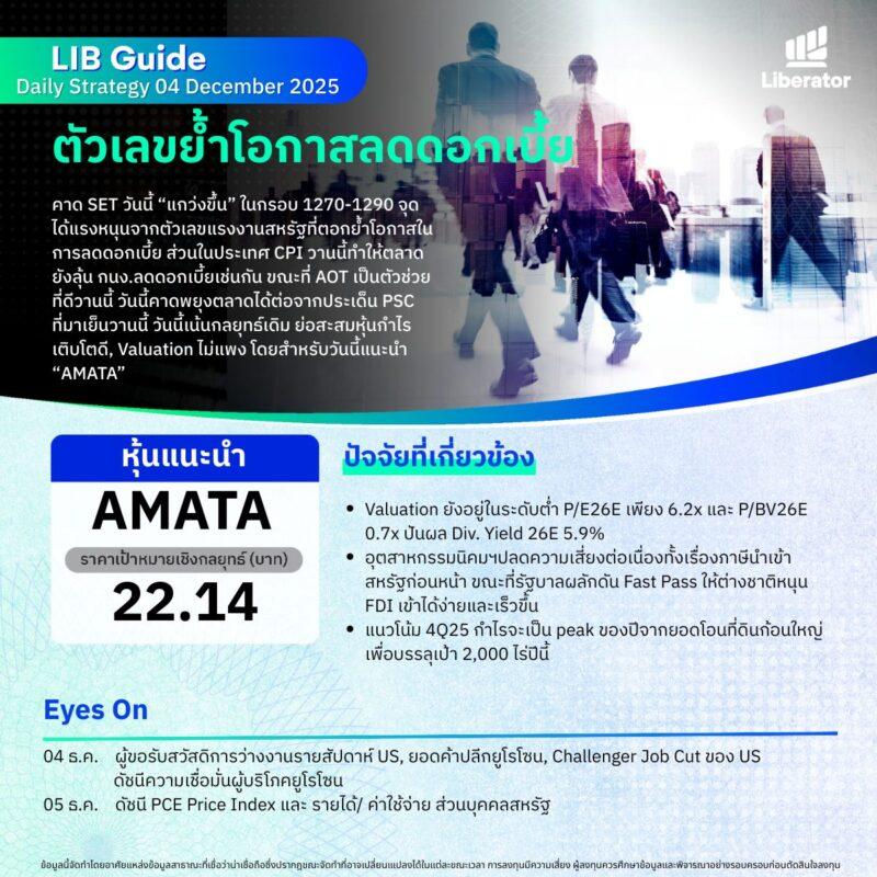 วันที่ 4 ธันวาคม 2568 บริษัทหลักทรัพย์ ลิเบอเรเตอร์ จำกัด หรือ “Liberator” (บล.ลิเบอเรเตอร์) ออกบทวิเคราะห์ “LIB Guide Daily Strategy”  ประจำวันพฤหัสบดี ที่ 4 ธันวาคม 2568 หัวข้อ “ตัวเลขย้ำโอกาสลดดอกเบี้ย
