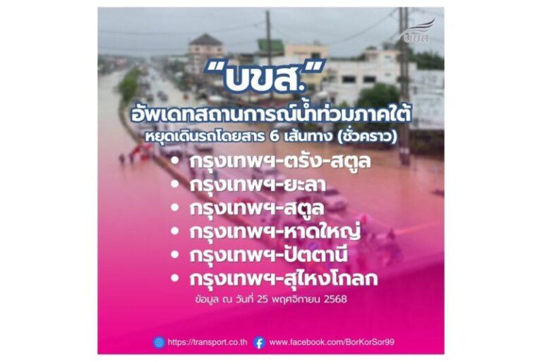 “บขส.” อัพเดทสถานการณ์น้ำท่วมภาคใต้ยังวิกฤต หยุดเดินรถโดยสาร 6 เส้นทางชั่วคราว